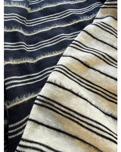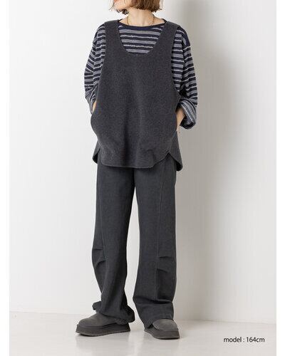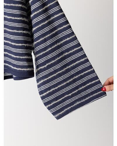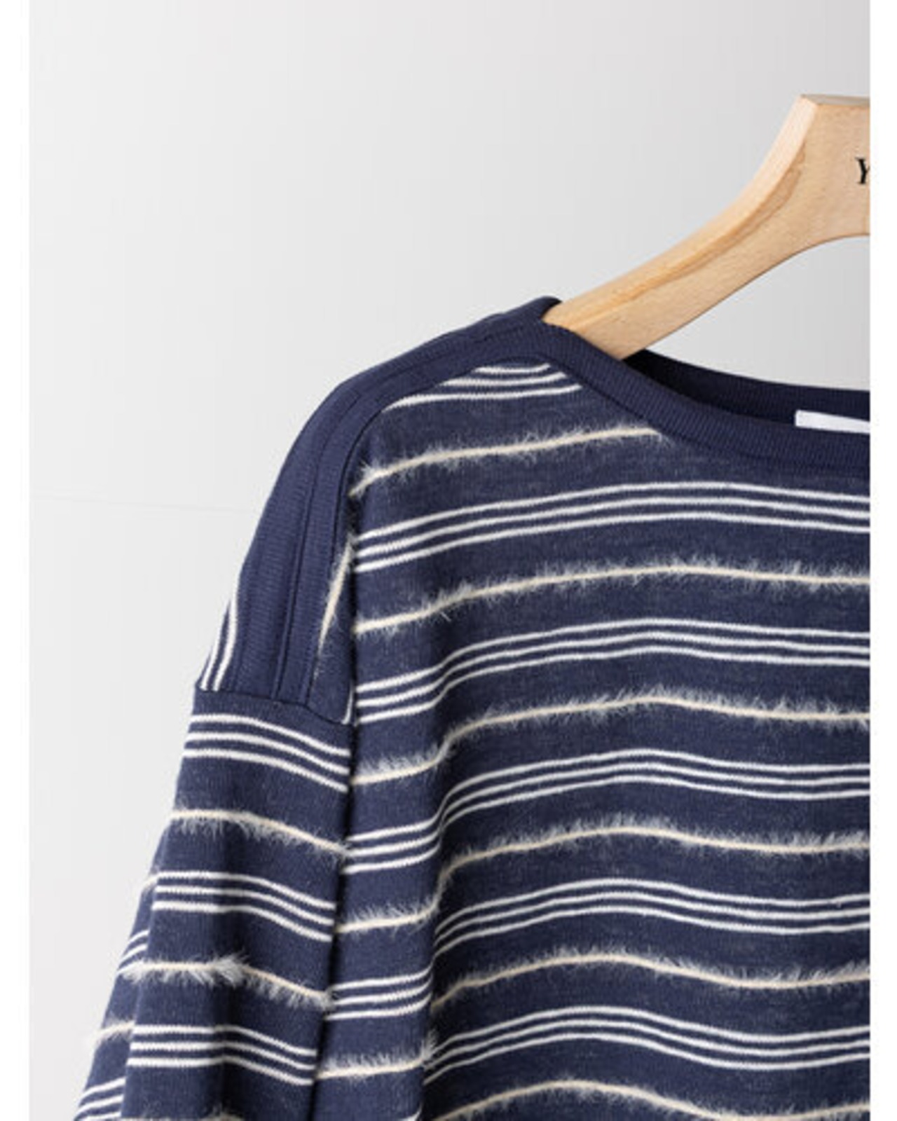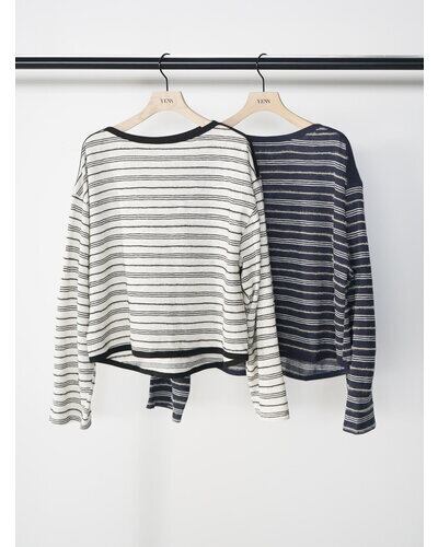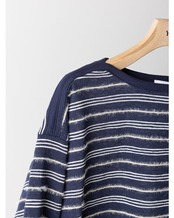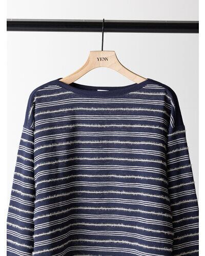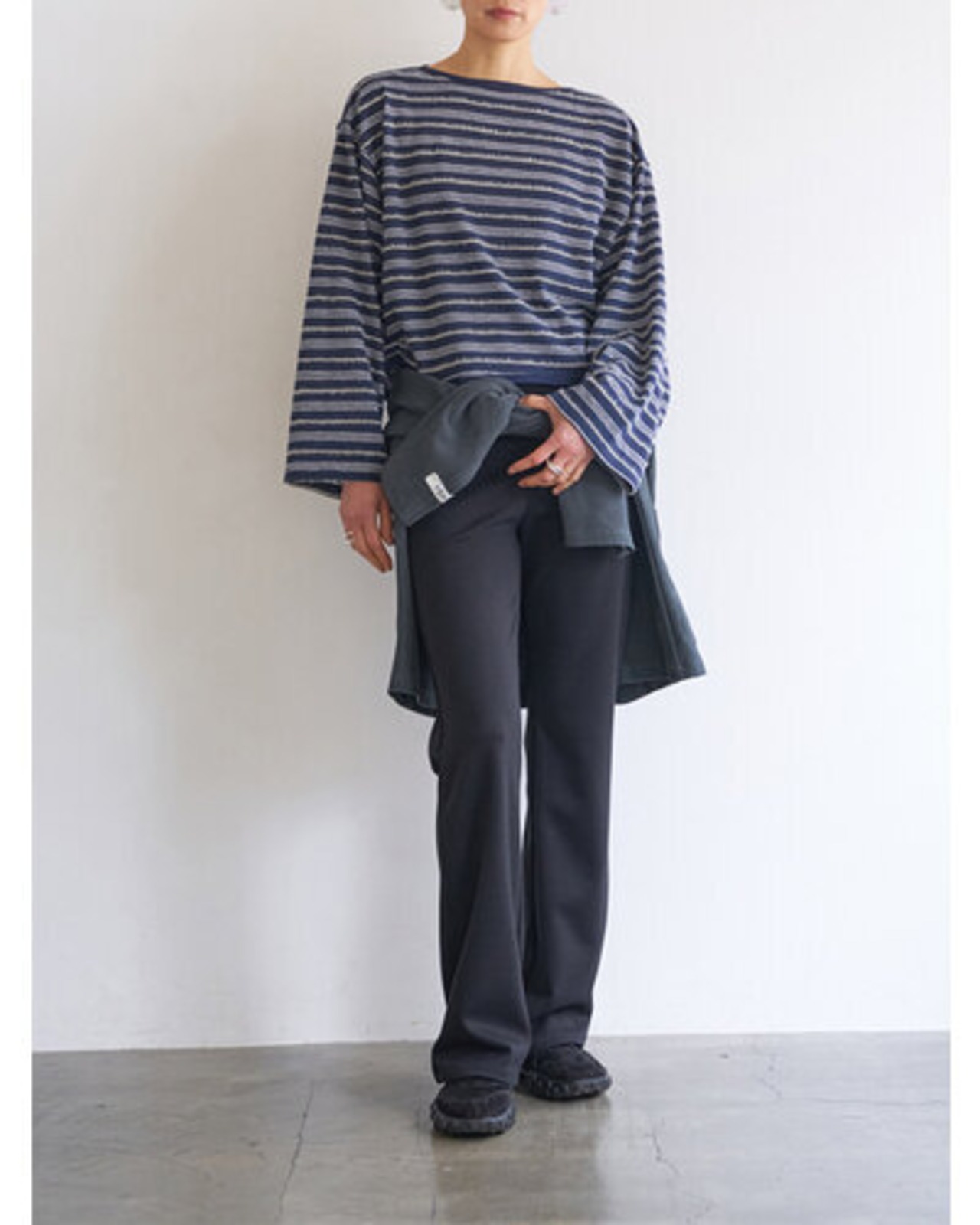 マルチボーダーの一部がフェザー素材で切り替えられている素材を使用した印象的なボーダートップス。ふわふわと柔らかな毛足のあるフェザーラインが、カジュアルなボーダーにさりげない女性らしさを添えています。衿ぐりはボートネックに仕上げ、デコルテを美しく見せる上品なシルエットに。ワイドなスリーブと、バランスよく設定した着丈がポイント。スカートやボリュームのあるパンツとも好相性で、シンプルなスタイリングでも程よい存在感を放つ一枚です。