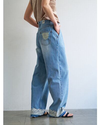 定番のタックワイドパンツと同じメンズライクな13.2オンスデニムを使用。無骨な印象のデニムにフェミニンなレースが相反するデザインで、レースを付けてから加工をすることでレースとデニムの風合いを馴染ませたビンテージ感がポイントです。裾は一度縫ったものを解いて作る断ち切りデザイン、後裾で深めにダーツをとって、ワイドシルエットのパンツを買って自分でリメイクしたようなストーリーを持たせました。後のベルトとポケットには金属チャームやニットパッチを付けてカスタマイズデニム風に仕上げています。