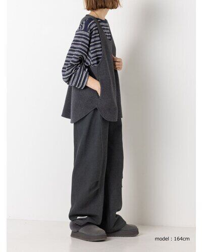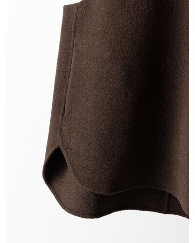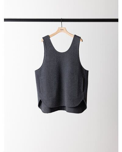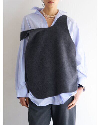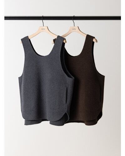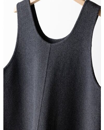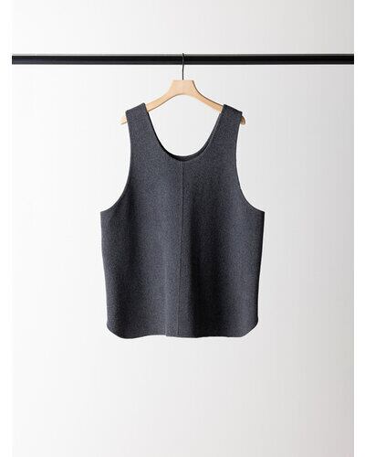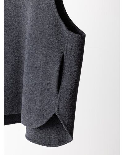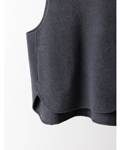 深く衿ぐりをあけたUネックデザインと大胆にあいたアームホールは中に着るものを選ばず、着脱もイージーにしていただけます。通常はコート等に使用する厚手で上質な素材を使用、ミニマルなデザインながら存在感があり、シンプルな日常のコーディネートを格上げしてくれるアイテムです。
