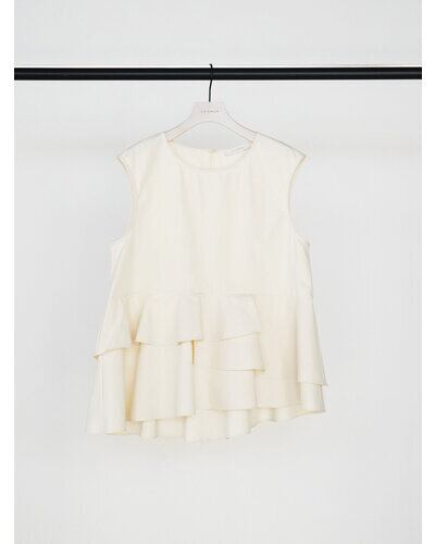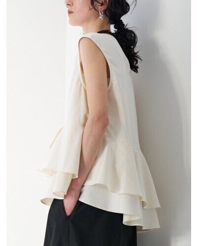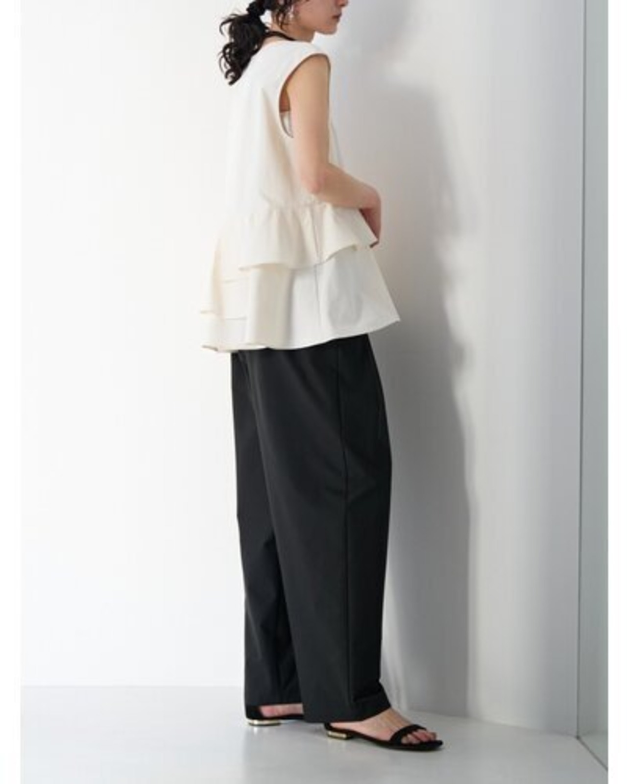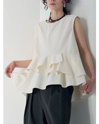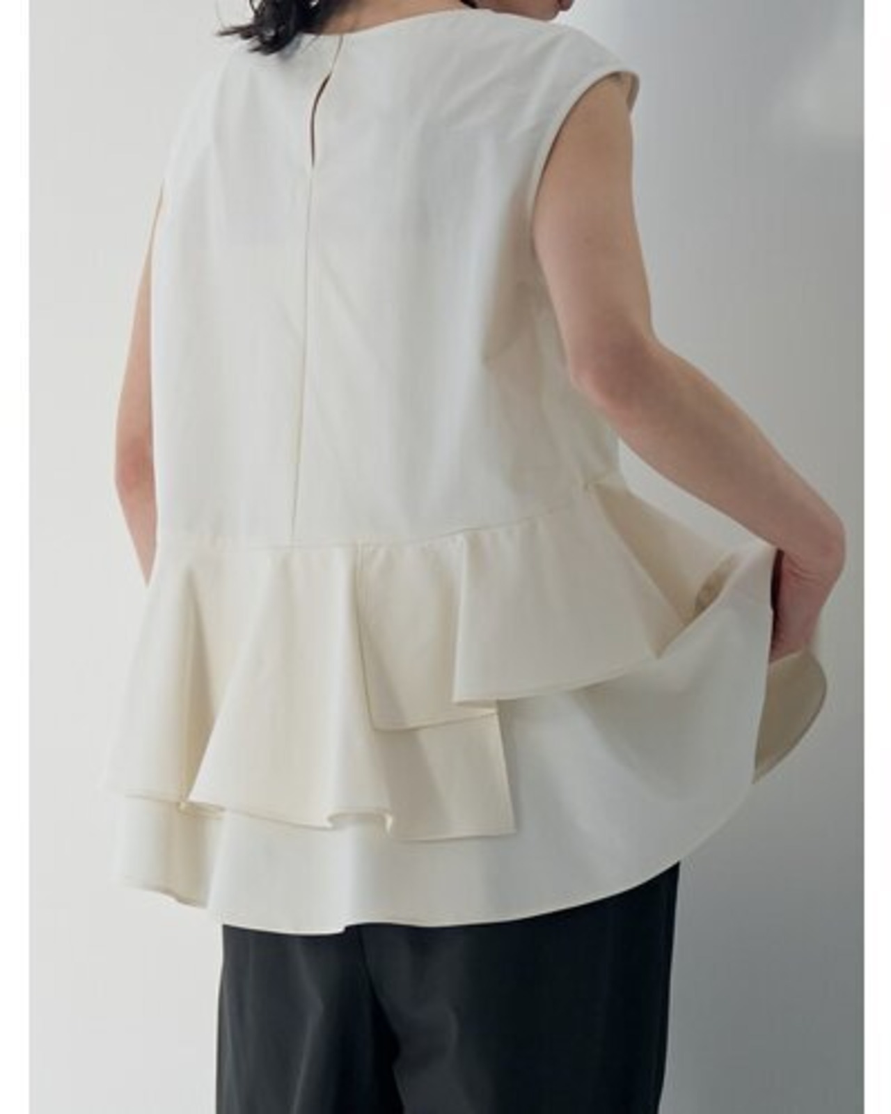 デザインは今の気分を取り入れたペプラムシルエット。ウエスト切り替えから広がるランダムなフレアが立体感を生み出し、甘くなりすぎずモードな印象に仕上げました。動くたびに揺れるヘムラインが、シンプルながらも着映えするポイントです。