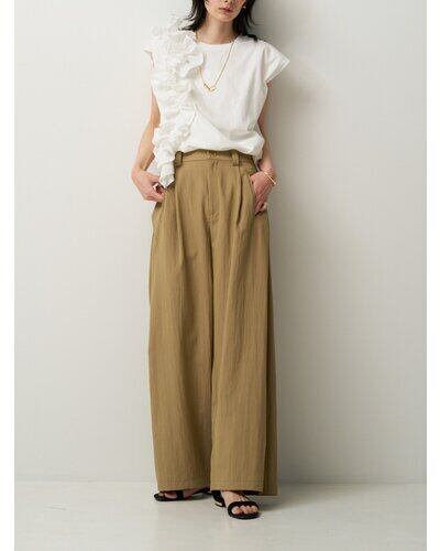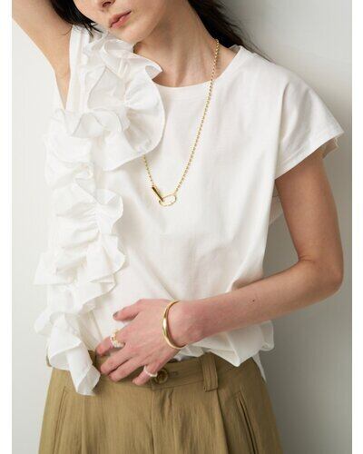 片側に流れるように重ねたフリルが、シンプルな身頃に奥行きと動きを生み出し、着るだけでスタイリングの主役になる一枚です。