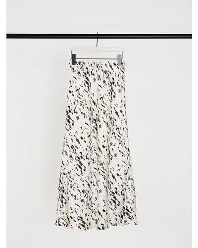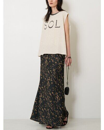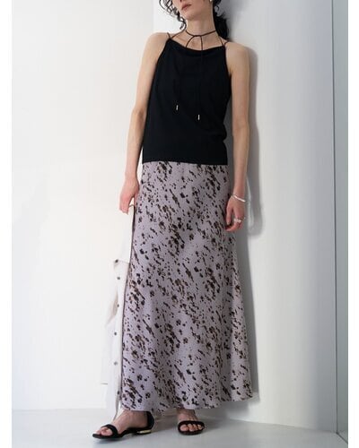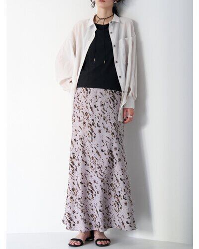 腰まわりはすっきりと、裾にかけて広がるマーメイドシルエットが女性らしいラインを演出。動くたびに揺れる軽やかなドレープ感も魅力です。