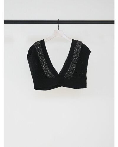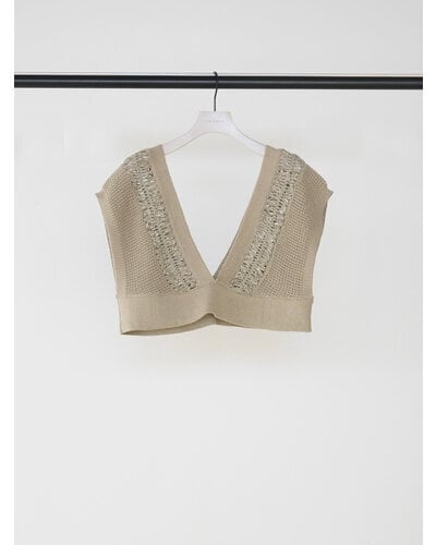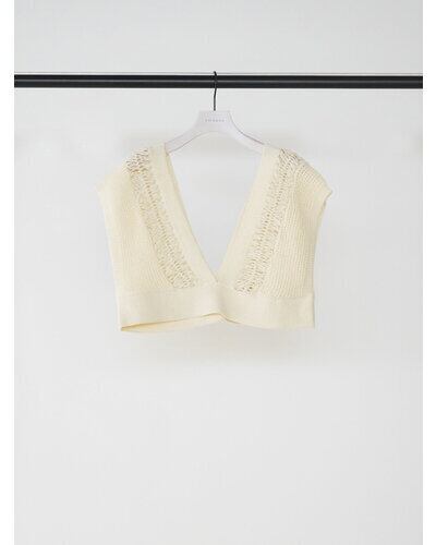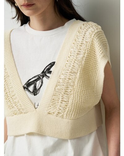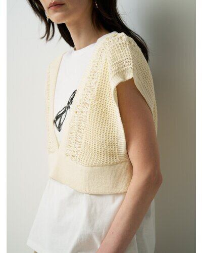 繊細なクロッシェ編みと立体感のある編地を組み合わせた、レイヤードスタイルに映えるショートニットベスト。
