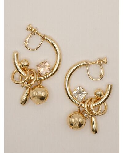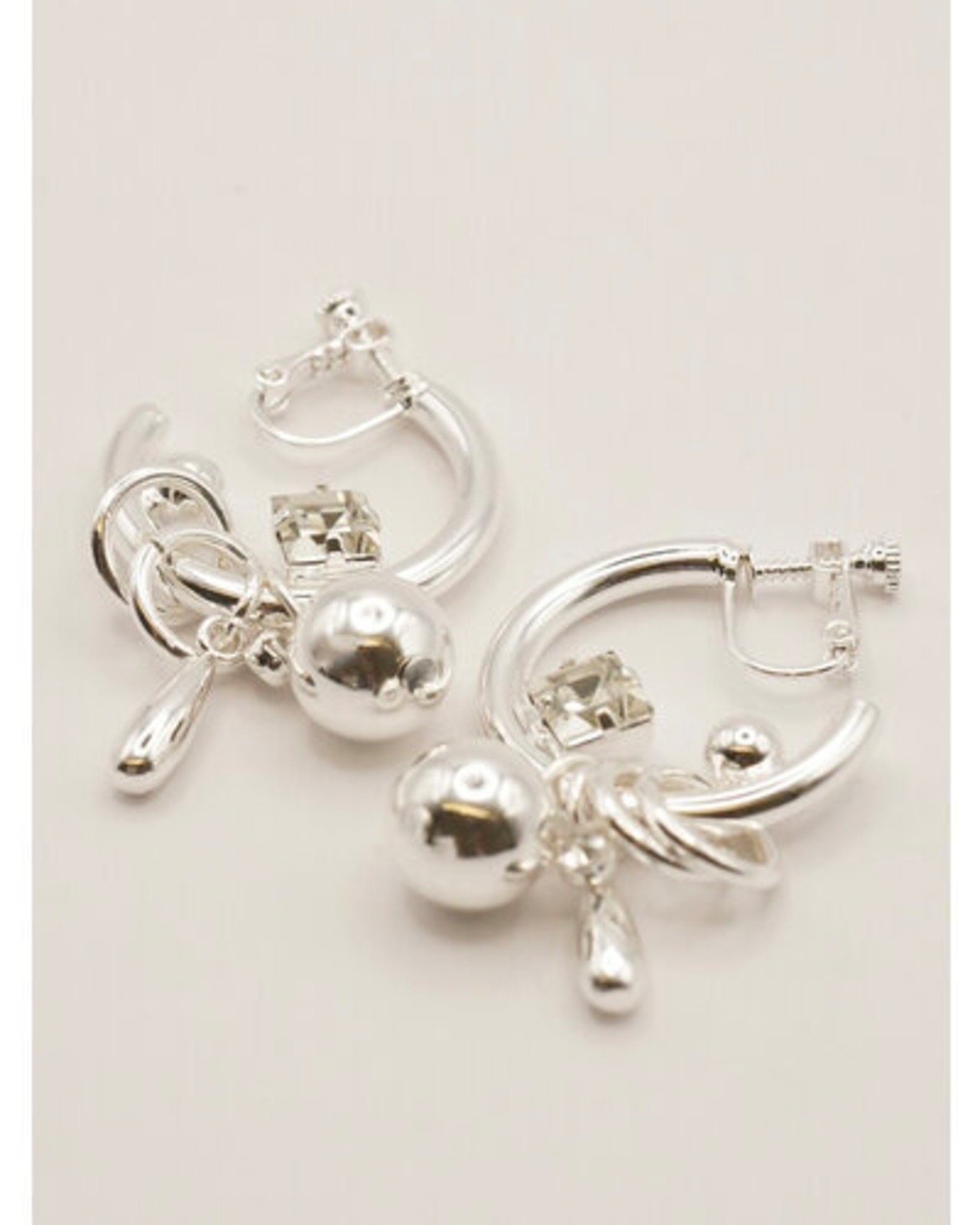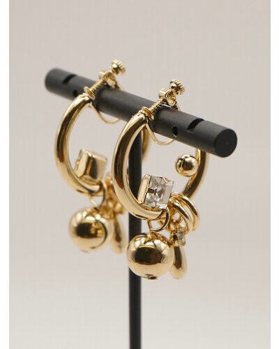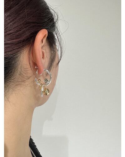 じゃらっとしたモチーフと程良いボリューム感が印象的な遊び心たっぷりのフープイヤリング。それぞれのパーツをバランスよく配置しつつ動きを活かしたデザインは、着けるだけで一際目立つ主役級イヤリングとなっております。カラーはシルバー、ゴールドの他に、SV×GDのミックスもご用意いたしました。同型でピアスもご用意いたしております。