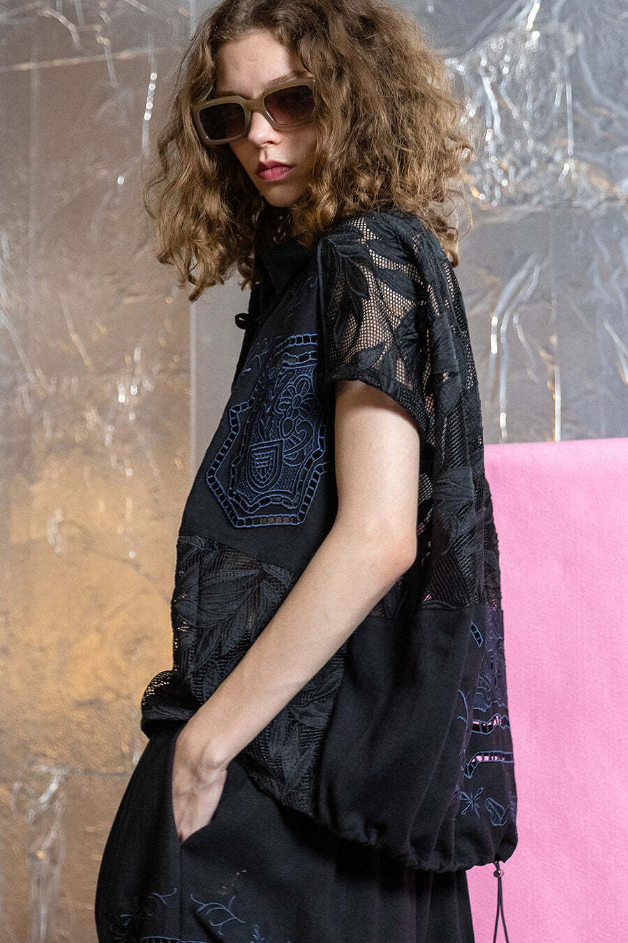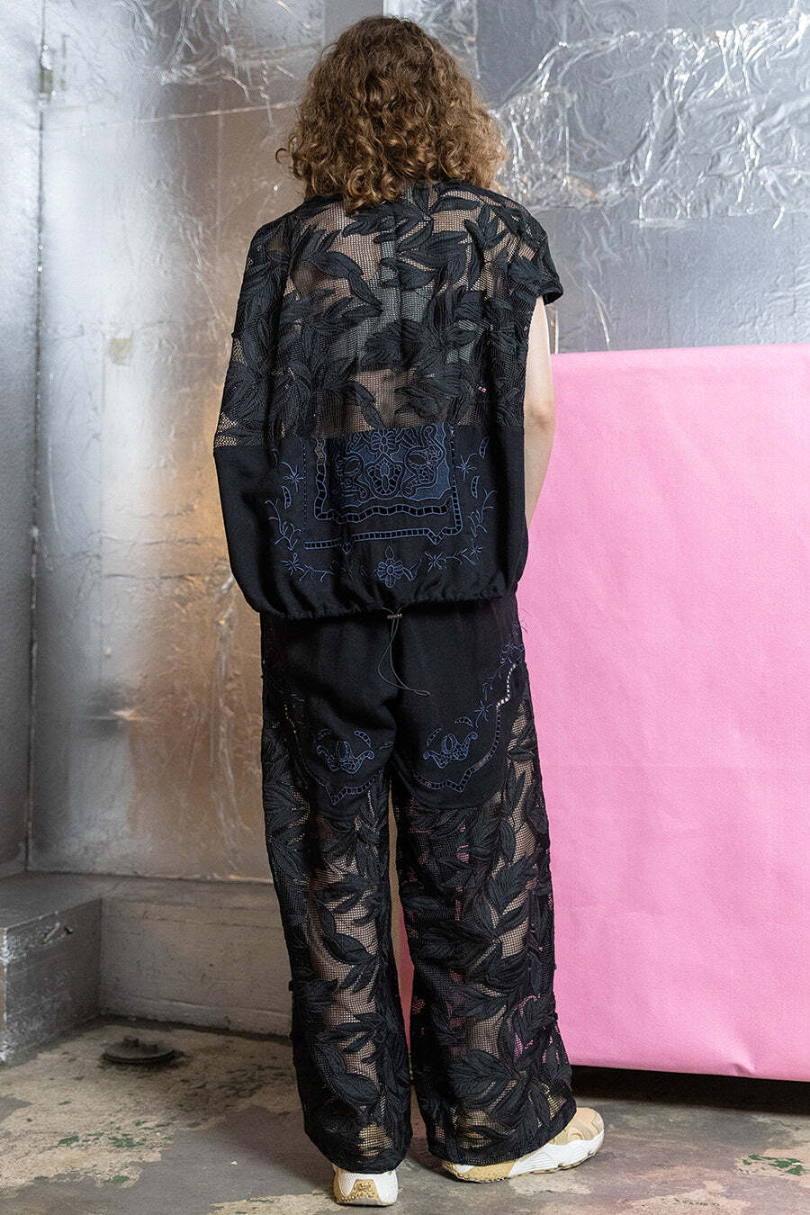 リーフ柄のアップリケ刺繍のメッシュ生地が