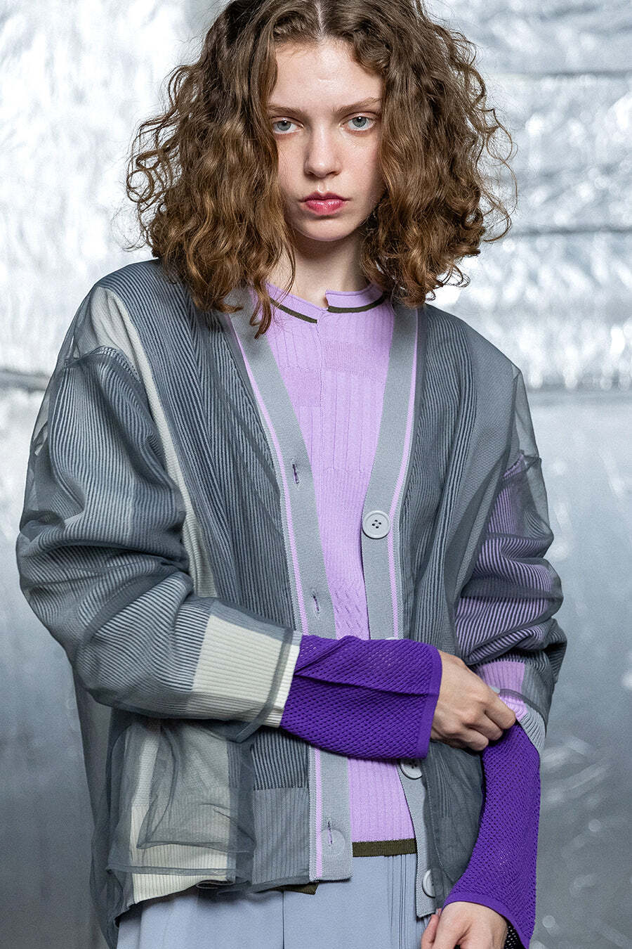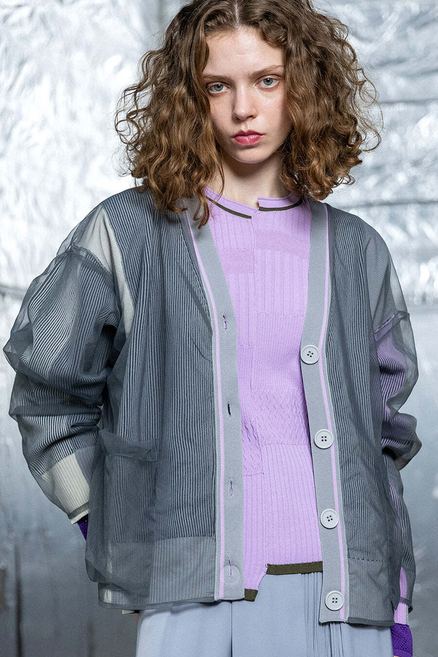 軽くてストレッチ性の高いポリエステル糸を使用したカーディガン。