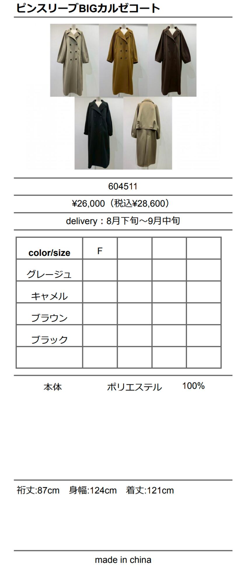 CYANtokyo'26A/W ピンスリーブBIGカルゼコート【604511】