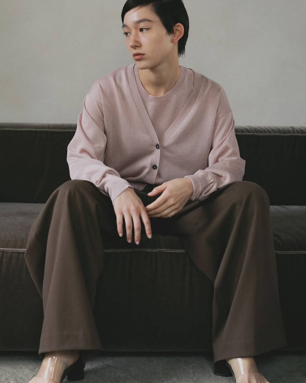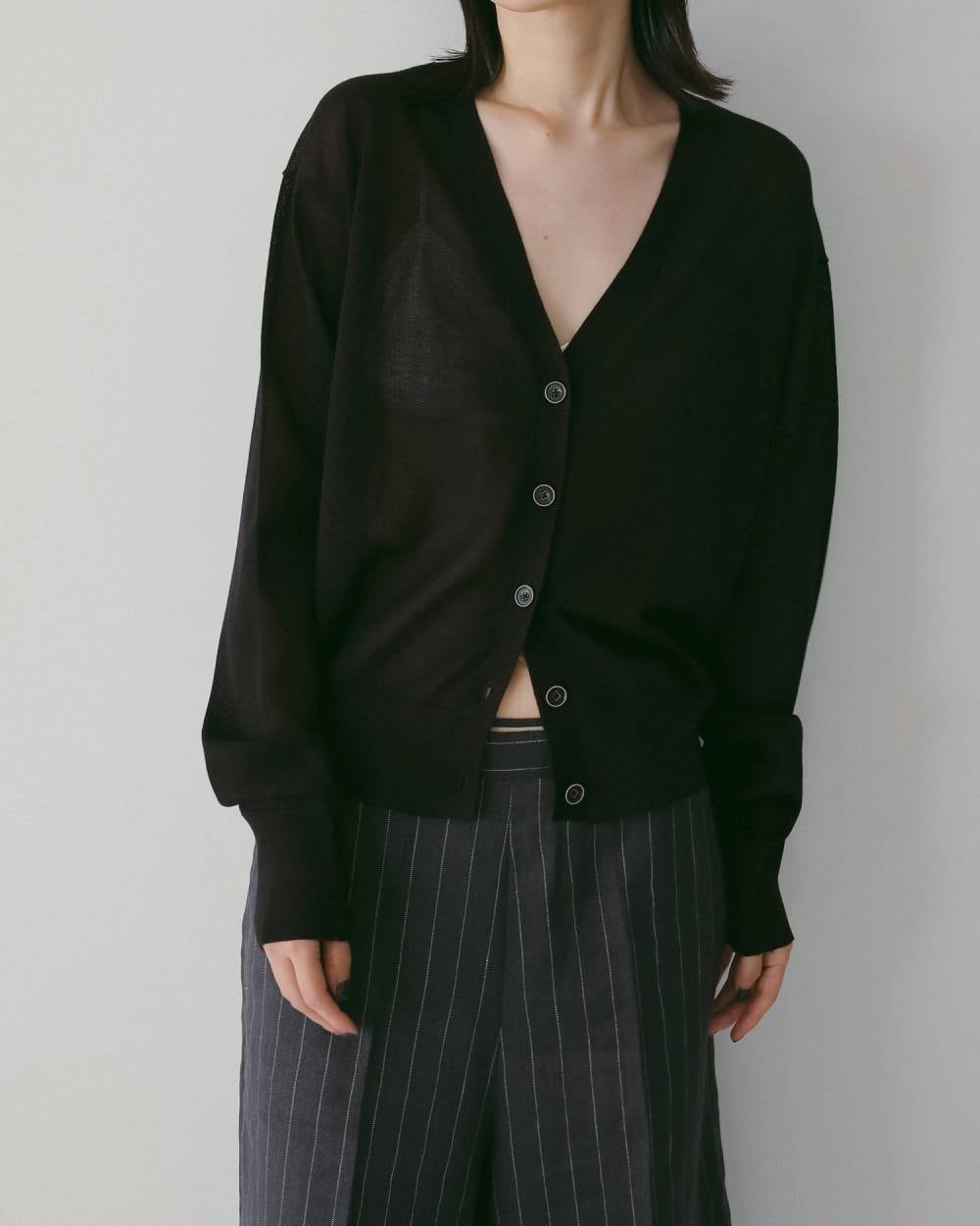 ハイゲージで仕上げた薄手のVネックカーディガン。着回し力あるミニマルなデザイン。ほんのりと透ける上品な編み地で、春の羽織りとしても活躍する一枚。程良くルーズなシルエットとデコルテが見えるVネックで、女性らしく抜け感ある印象に。前を留めた際も、フロントのデザインボタンがアクセントになり、プルオーバーとして着た際も、コーディネートに映えます。同素材のHighgauge Sheer Tanktopとのレイヤードスタイルも楽しんでいただきたい一着。肩にかけたり、腰に巻いたり、スタイリングのポイントとして着回していただくのもおすすめです。